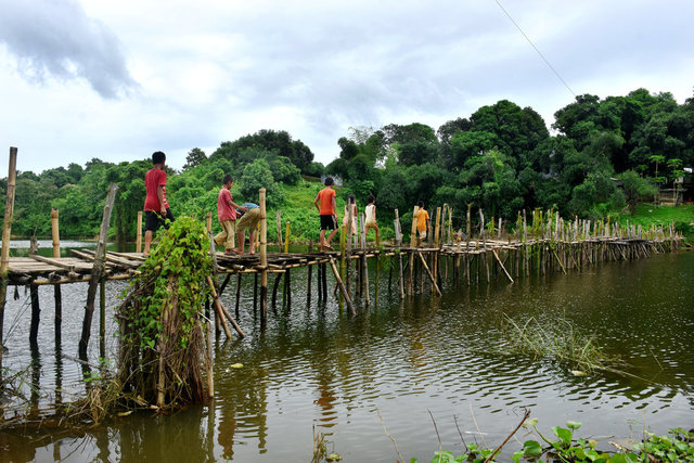 Tehlikeli bambu köprüsünden geçmek cesaret istiyor