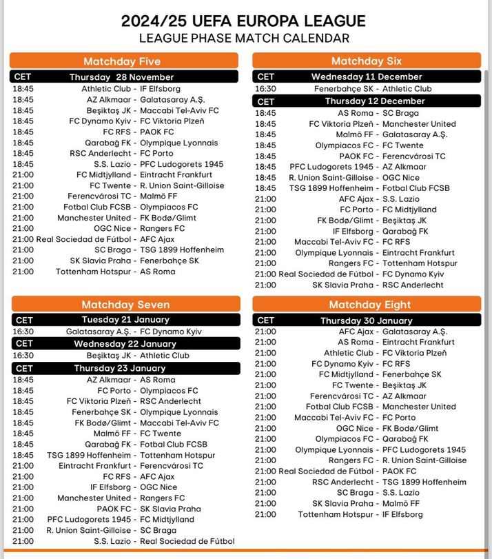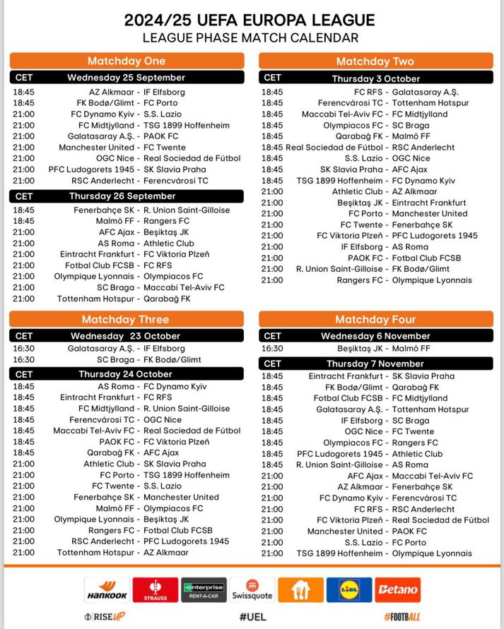 UEFA Avrupa Ligi'nde maç programı belli oldu. Temsilcilerimizden Beşiktaş ilk maçını deplasmanda Ajax ile oynayacak. Fenerbahçe evinde Union SG maçıyla, Galatasaray ise sahasında PAOK karşılaşmasıyla sezonu açacak.