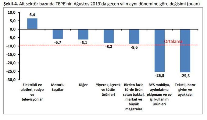 Buna göre, perakende güvenine alt sektörler itibarıyla bakıldığında Ağustos'ta, geçen yılın aynı dönemine göre "elektrikli ev aletleri, radyo ve televizyonlar" sektöründe artış "motorlu taşıtlar", "diğer (akaryakıt istasyonu, eczane, parfümeri, nalbur, zücaciye, kırtasiye, vb.)", "yiyecek, içecek ve tütün ürünleri", "birden fazla türde ürün satan bakkal, market ve büyük mağazalar", "mobilya, aydınlatma ekipmanı ve ev içi kullanım ürünleri" ve "tekstil, hazır giyim ve ayakkabı" sektörlerinde azalış görüldü.