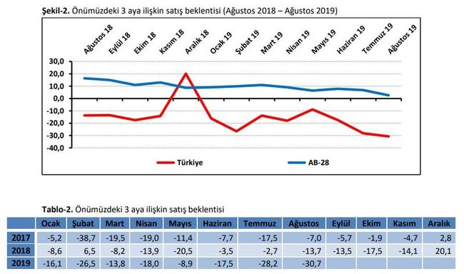 Önümüzdeki üç aya ilişkin satış beklentilerinin denge değerinin, Ağustos ayında -30.7 puan olduğu belirtilen açıklamada, "Buna göre önümüzdeki üç aya ilişkin satış beklentileri, bir önceki aya göre 2.5 puan, bir önceki yılın aynı ayına göre 17.0 puan azaldı. Ağustos 2019´da TEPE anketi katılımcılarının yüzde 22.1´i önümüzdeki üç ayda işlerinde iyileşme beklerken, yüzde 47.5´i işlerinde kötüleşme beklediğini belirtti. İşlerinde bir değişiklik beklemeyenlerin oranı ise, yüzde 30.4 oldu" denildi.