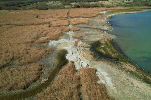 Havadan çekilen gölde su seviyesinin gerilemesi nedeniyle bazı alanların kuruduğu, bu nedenle tarihi yolun ortaya çıktığı görüldü.