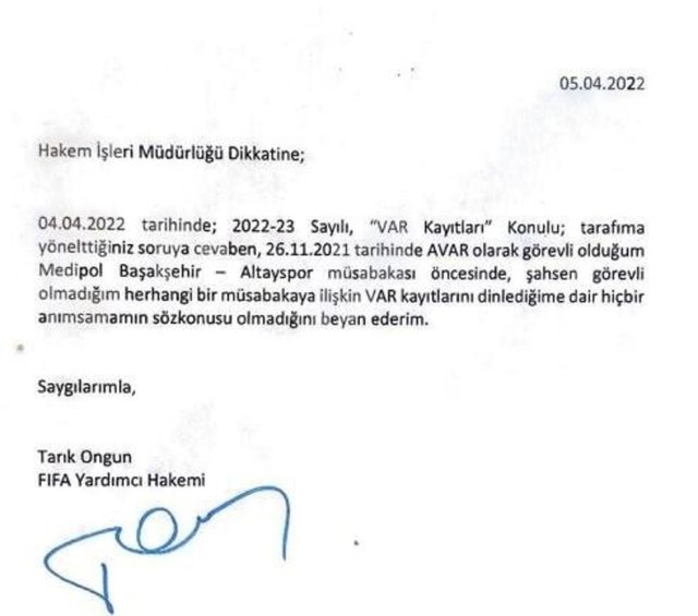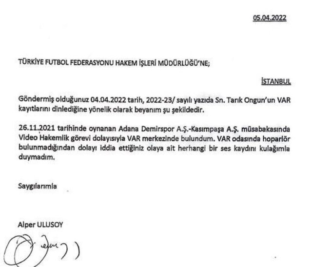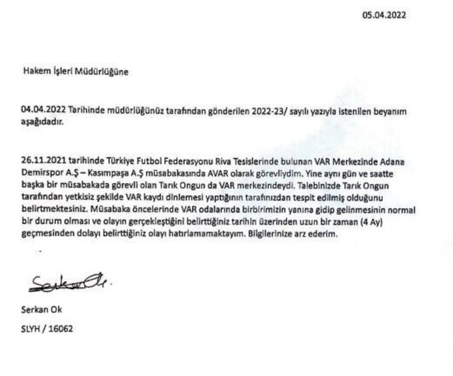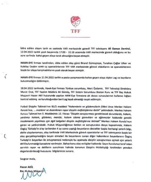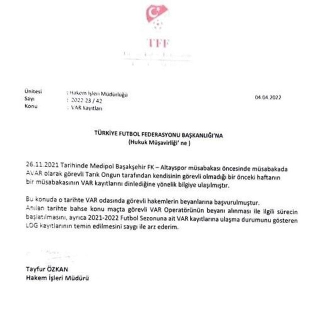 Raporun 8. sayfasında Hakem İşleri Müdürü Tayfur Özkan'ın TFF Hukuk Müşavirliği'ne yazdığı yazı yer aldı. Bu yazıda 'Bahse konu maçta görevli VAR operatörünün beyanı alınması ile ilgili sürecin başlatılmasını, ayrıca 2021-2022 Futbol Sezonuna ait VAR kayıtlarına ulaşma durumunu gösteren LOG kayıtlarının temin edilmesini saygı ile arz ederim' beyanı yer aldı.