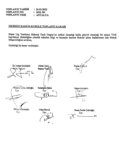 Raporun 7. sayfasında Ferhat Gündoğdu, Yunus Yıldırım ve Ahmet Şahin'in imzalarının bulunduğu, el yazısıyla yazılmış bir tutanak yer aldı. Bu tutanakta "Galatasaray - Fenerbahçe müsabakasının VAR kayıtlarının bir hafta sonrası yetkisiz bir şekilde Tarık Ongun tarafından dinlendiğini ve bu olaya bizzat orada görevi Özgüç Türkalp tarafından şahit olunduğu iletilmiştir. Bu bilgi MHK başkanı tarafından araştırılmış ve olaya şahit olan Özgüç Türkalp'i dinlemiştir. Edinilen bu bilgiler ışığında ve bir süre önce Cüneyt Çakır tarafından 'Bende tüm VAR kayıtları mevcut' ifadesini telefonda MHK başkanına söylemesi üzerine anılan olayın açıklığa kavuşturulması amacıyla hukuki işlem başlatılmasına karar verilmiştir." beyanları dikkat çekti.