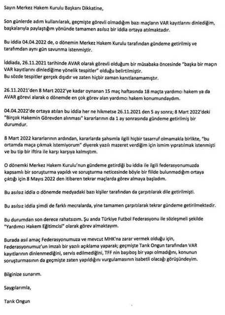 10. sayfada Tarık Ongun'un ifadeleri yer aldı. Tarık Ongun'un, "Asılsız iddia o dönemde medyadaki bazı kişiler tarafından çarpıtılarak dile getirilmişti. Bu durumdan son derece rahatsızım. Şu anda TFF ile sözleşmeli şekilde 'Yardımcı Hakem Eğitimcisi' olarak görev almaktaydım. Burada asıl amaç Federasyonumuza ve mevcut MHK'na zarar vermek olduğu için, Federasyonumuz'un imzalı bir yazılı açıklama yaparak; geçmişte Tarık Ongun tarafından VAR kayıtlarının dinlenmediğini, servis edilmediğini, TFF'nin başıboş bir yapı olmadığını, konunun soruşturmasının da geçmişte zaten yapıldığını vurgulamasının isabetli olacağı görüşündeyim." satırları bu sayfa yer aldı.