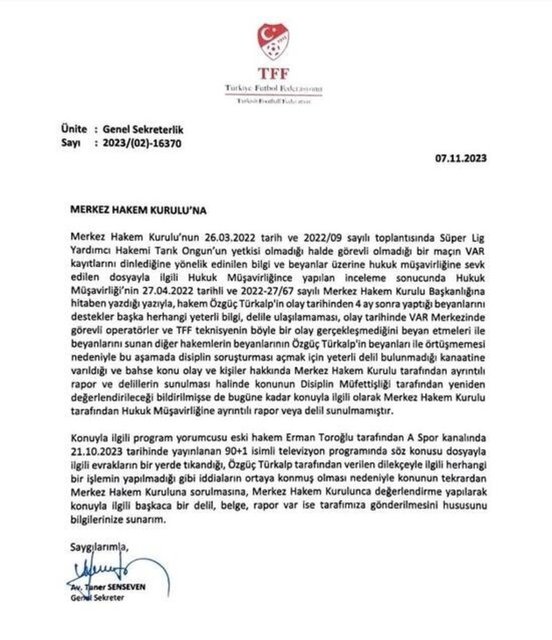 Raporun 7 Kasım 2023 tarihli üçüncü sayfasında ise Genel Sekreter Av. Taner Senseven imzasıyla bir belge yayınlandı. Bu belgede "Hukuk Müşavirligi'nin 27.04.2022 tarihli ve 2022-27 /67 sayılı Merkez Hakem Kurulu Başkanlığına hitaben yazdığı yazıyla, hakem Özgüç Turkalp'in olay tarihinden 4 ay sonra yaptığı beyanları destekler başka herhangi yeterli bilgi, delile ulaşılamaması, olay tarihinde VAR Merkezinde görevli operatörler ve TFF teknisyeninin böyle bir olay gerçekleşmedigini beyan etmeleri ile beyanlarını sunan diger hakemlerin beyanlarının Özgüç Türkalp'in beyanları ile örtüşmemesi nedeniyle bu aşamada disiplin soruşturması açmak için yeterli delil bulunmadığı kanaatine varıldığı ve bahse konu olay ve kişiler hakıında Merkez Hakem Kurulu tarafından ayrıntılı rapor ve delillerin sunulması halinde konunun Disiplin Mufettişligi tarafından yeniden değerlendirileceği bildirilmiise de bugune kadar konuyla ilgili olarak Merkez Hakem Kurulu tarafından Hukuk Müşavirliğine ayrıntılı rapor veya delil sunulmamıştır." denildi.