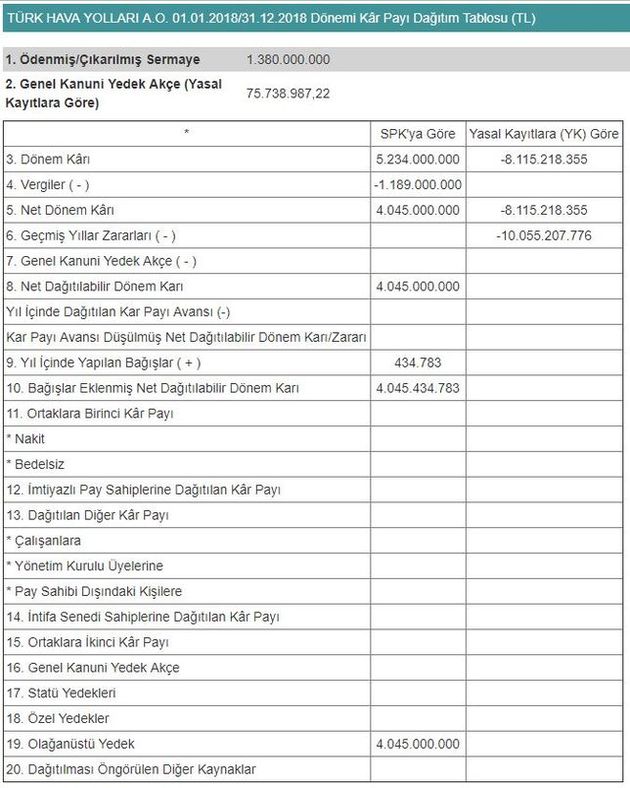 Reuters'ın haberine göre, KAP'a yapılan bir diğer açıklamada da, 2018 hesap döneminde 4.05 milyar lira net dönem karı elde edildiği hatırlatılarak, "Yasal kayıtlarda ise geçici vergi beyannamesine göre 8.1 milyar lira net dönem zararı vardır. Ayrıca yasal kayıtlarda 10.06 milyar TL geçmiş yıllar zararları bulunmaktadır. Olağan Genel Kurul toplantısında hissedarların görüş ve onayına arz edilmek üzere; ortaklığımız yasal kayıtlarında bulunan net dönem zararının geçmiş yıllar zararlarına transfer edilmesi, yasal kayıtlarda kar payı dağıtımına konu edilecek kaynak bulunmadığından, TFRS'ye uygun olarak hazırlanan mali tablolara göre elde edilmiş olan 4.05 milyar TL net dönem karının da geçmiş yıllar karlarına transfer edilmesi uygun olup 2018 yılı Kar Payı Dağıtım Tablosu ekte sunulmaktadır." denildi