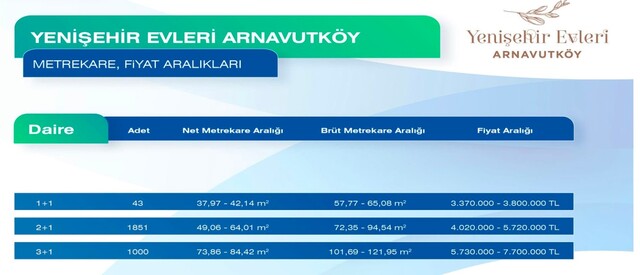 YENİŞEHİR EVLERİ ARNAVUTKÖY PROJESİ 1+1, 2+1 VE 3+1 DAİRE FİYATLARI