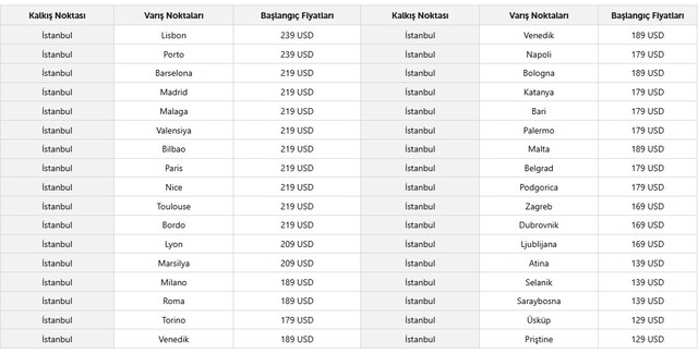 THY BİLET KAMPANYASININ GEÇERLİ OLDUĞU UÇUŞLAR