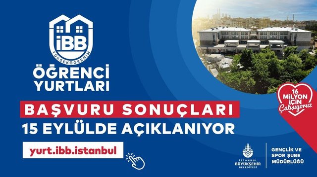 İstanbul Büyükşehir Belediyesi, yurt başvuru sonuçları açıklandı. İBB Gençlik ve Spor sosyal medya hesabından yapılan açıklamada; "İBB Yükseköğrenim Öğrenci Yurtları Başvuru Sonuçları Açıklandı. Birlikte başarı dolu, keyifli bir eğitim öğretim yılı geçirmemiz dileğiyle." ifadelerine yer verildi.