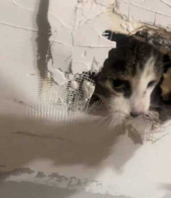Yeni döşenen sıvayı dakikalarca bıçakla parçaladıktan sonra kedi serbest kaldı ve sahibiyle buluştu.