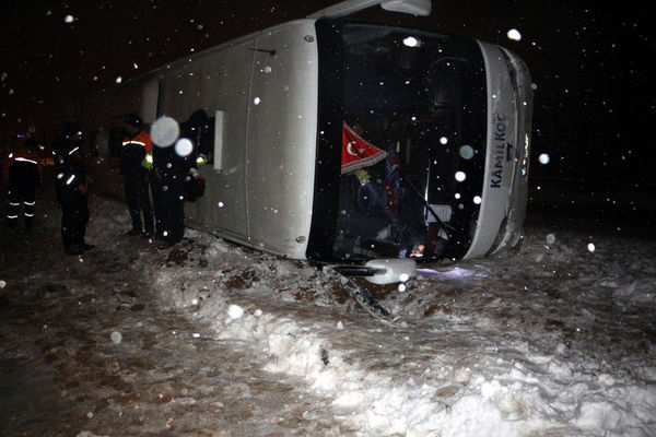Tokat'ta kar yağışı ve buzlanma nedeniyle sürücüsünün kontrolünden çıkan yolcu otobüsü refüje devrildi. Kazada otobüste bulunan 23 kişi yaralandı.