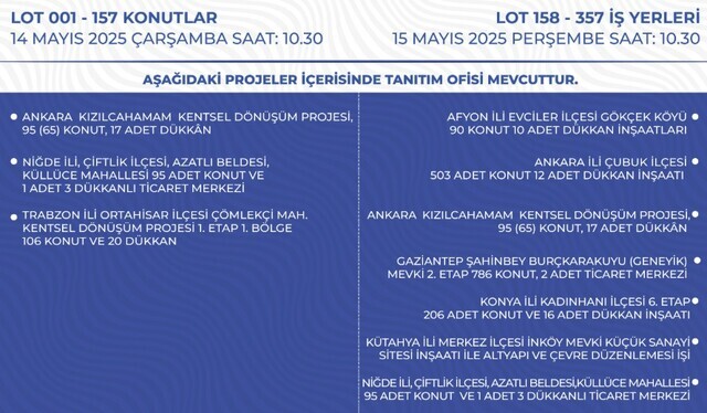 TOKİ 357 gayrimenkulü saat 14-15 Mayıs 2025 tarihlerinde saat 10.30'da yapılacak. Müzayede şu adreslerde gerçekleşecek;