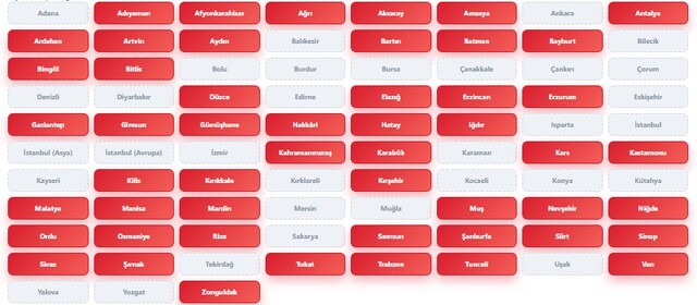 Kırmızı renkli illere tıklandığında ilgili kura sonucu sayfası yeni sekmede açılıyor. Gri renkte gösterilen illerin kura sonuçları ise henüz belli olmadı.
