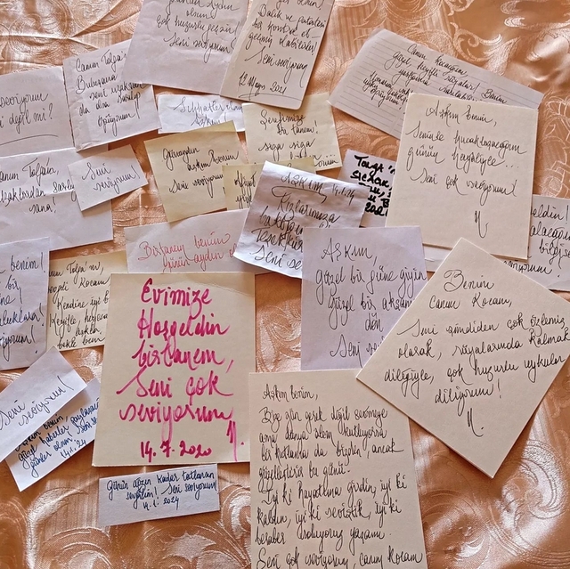 Bugün seni uğurladığım yuvamızda çekmeceleri açıp baktım sevgilim... Ben seyahate giderken, sen işe giderken küçük notlar bırakırdım, çamaşır çekmecelerine, okuduğun kitabın arasına, montunun cebine, bilgisayarının íçine, şeker kavanozuna, tıraş setinin dibine... Kullandıkça karşına sūrpriz çıksın diye... Nasıl mutlu olurdun, her birini buldukça. Türkiye'de isem, arar, haber verir, teşekkür ederdin. Aşkım benim, yüzlerce biriktirmişsin hepsini bir dosyada...