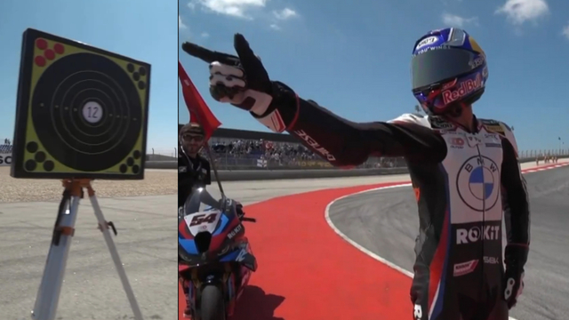 Şampiyona tarihine geçen ve zafer kutlamasını milli atıcı Yusuf Dikeç'in Paris 2024 Yaz Olimpiyatları'nda gümüş madalya kazandığı atış tarzıyla yapan Toprak Razgatlıoğlu, piste getirilen hedef tahtasını "12"den vurdu.