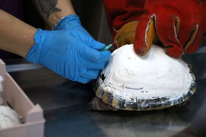 'Tosbik' adı verilen kaplumbağanın kabuğunun tedavisi için diş hekimlerinin kullandığı dolgu malzemesi kullanılıyor.