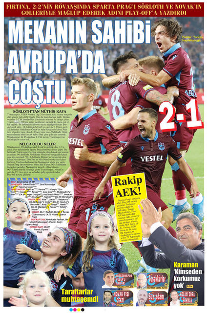 Taka gazetesi, "Akyazı'da muhteşem gece" başlığıyla yer verdiği haberde, Trabzonspor'un Akyazı'da 40 bini aşkın taraftarıyla Sparta Prag'ı yenerek evine gönderdiğini vurguladı.