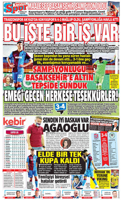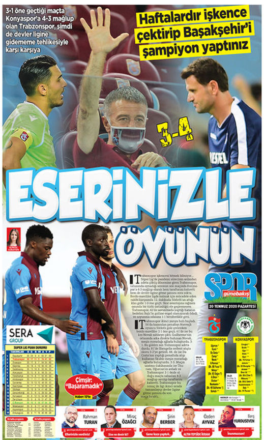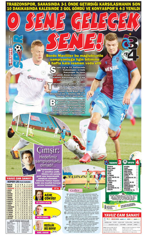 Günebakış gazetesi, "Eserinizle övünün", "Haftalardır işkence çektirip Başakşehir´i şampiyon yaptınız", Taka gazetesi, "Rezalet", "Sözün bittiği yer, Trabzonspor´un 3-1 öne geçtiği maçta Konyaspor´a dramatik bir şekilde mağlup olmasının akılla izahı yok", "Rüya gibi geçen sezon hayal kırıklığı ile bitti", Karedeniz gazetesi, "Bu işte bir iş var", "Şampiyonluğu Başakşehir´e altın tepside sunduk. Emeği geçen herkese teşekkürler!", Kuzey Ekspres gazetesi, "O sene gelecek sene!", Karadeniz´de Sonnokta gazetesi, "Gözyaşlarına bile değmezsiniz" başlıklarını kullandı.