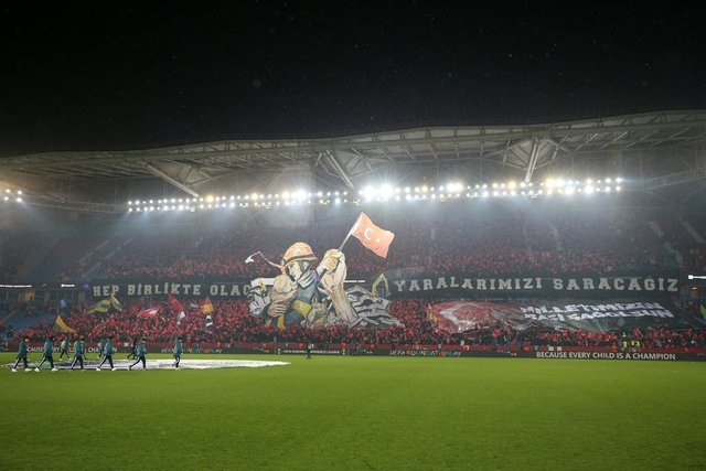 Geliri depremzedelere bağışlanan, futbol camiası ve her takımdan taraftarın kenetlenip, tribünlerde her renkten takımın bayrağının dalgalandığı müsabakaya `Vira´ grubunun koreografisi damgasını vurdu.