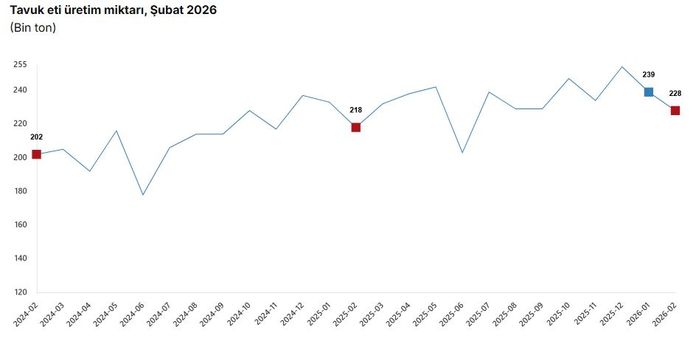 Şubat ayında bir önceki yılın aynı ayına göre; tavuk yumurtası üretimi yüzde 17,6 arttı, kesilen tavuk sayısı yüzde 5,9 arttı, tavuk eti üretimi yüzde 4,4 arttı. Ocak-şubat döneminde bir önceki yılın aynı dönemine göre, tavuk yumurtası üretimi yüzde 16,3 arttı, kesilen tavuk sayısı yüzde 4,4 arttı, tavuk eti üretimi yüzde 3,3 arttı.