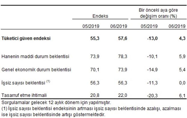 Türkiye İstatistik Kurumu ve Türkiye Cumhuriyet Merkez Bankası işbirliği ile yürütülen tüketici eğilim anketi sonuçlarından hesaplanan mevsim etkilerinden arındırılmış tüketici güven endeksi, Haziran ayında bir önceki aya göre %4,3 oranında arttı; Mayıs ayında 55,3 olan endeks, Haziran ayında 57,6 oldu.