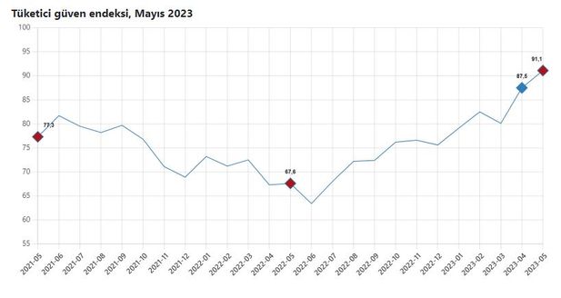 Tüketici eğilim anketi sonuçlarından hesaplanan mevsim etkilerinden arındırılmış tüketici güven endeksi, mayıs ayında bir önceki aya göre yüzde 4 yükseldi. TÜİK verilerine göre nisan ayında 87.5 olan endeks, mayıs ayında 91.1 oldu.