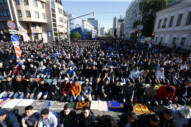 Rusya’nın başkenti Moskova'da Merkez Camisi’nde Ramazan Bayramı namazı kılındı. Camiye sığmayan binlerce Müslüman, caddelerde saf tuttu.