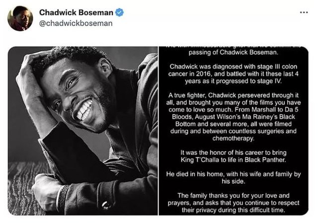 Ünlü oyuncu Chadwick Boseman’ın hayatını kaybettiği öğrendiğimiz o tweet: Beğeni sayısı 7,1 milyon
