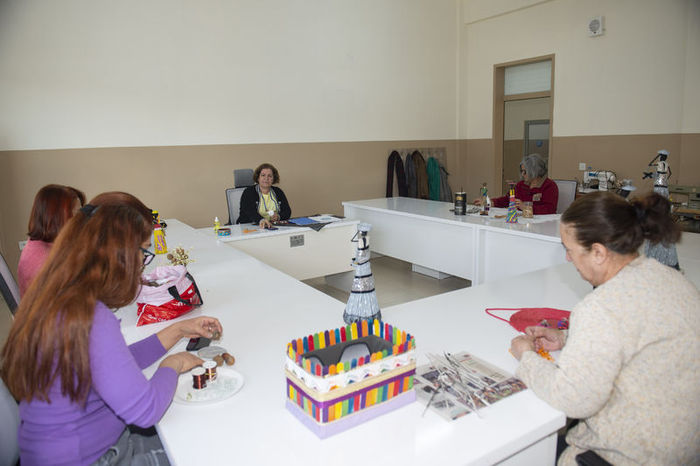 Haftanın 5 günü kursa katılan 20 kadın, yünden hayvan figürleri, bezden bebekler, yoğurt kovasından sepet, boncuktan mini masa çiçeği, alüminyum folyo, gazete ve plastik pipetten biblolar hazırlıyor. Çalışmalarla geri dönüşüme de katkı sunan kadınlardan kimi evine süs eşyası yapıyor kimi de yaptığı ürünleri açılan sergilerde satarak kazanç elde ediyor.
