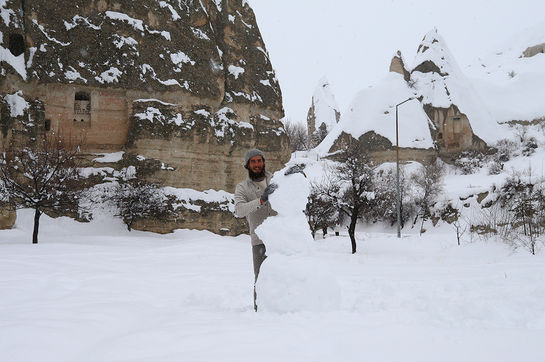 Arkadaşıyla peribacaları arasında kardan adam yapan Danimarkalı turist Katrina Stergard, AA muhabirine, ilk kez geldiği Kapadokya'nın coğrafi yapısına hayran kaldığını belirtti.