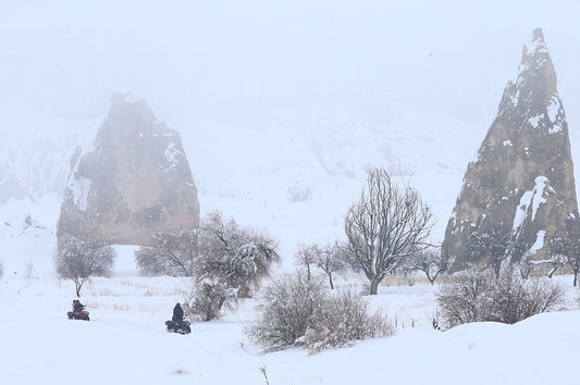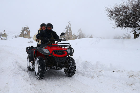 Türkiye'nin gözde turizm merkezlerinden Kapadokya'yı tercih eden turistler, beyaz örtüyle kaplanan vadilerde peribacalarını arazi araçlarıyla keşfe çıkıyor