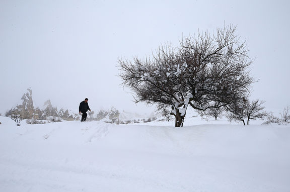 Kar yağışının ardından beyaza bürünen Kapadokya'daki vadilerde turistler manzaranın keyfini çıkarıyor.