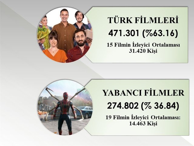 Pandemi nedeniyle izleyici sayısı düşen Türk filmleri yeniden yükselişe geçti. 4 - 6 Şubat arasındaki hafta sonunda gösterimde olan 34 filmin izlenme payının % 63.16'sı Türk yapımlarına ait. Gösterimdeki 15 Türk filmi için toplamda 471.301 bilet kesildi