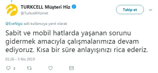 Turkcell müşteri hizmetleri, sosyal medyada kendilerine yöneltilen sorulara "Türkiye genelinde yaşanan bir sorun ve ekiplerimizin çalışması devam ediyor.. Bir süre beklemenizi rica ederiz" diye yanıt verdi.