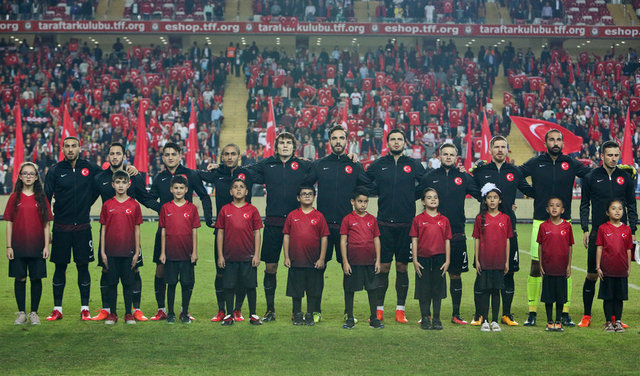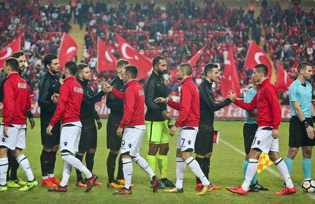 Öte yandan, Arnavutluk sahaya göğsünde Arnavutluk ve Türkiye bayrağı bulunan formalarla çıktı.