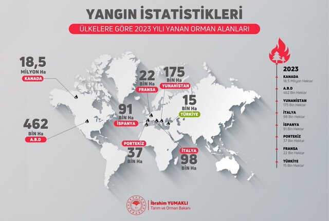 Bakan Yumaklı'nın paylaştığı infografikte, Türkiye'nin geçen yıl 15 bin hektar yanan orman alanıyla ABD, Kanada, Fransa ve Yunanistan gibi ülkelerin altında yer aldığı görüldü.
