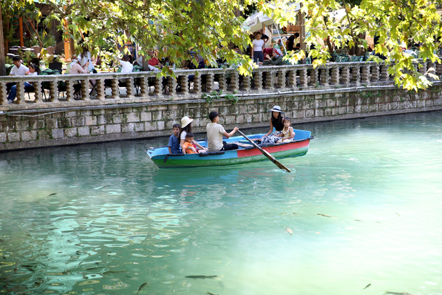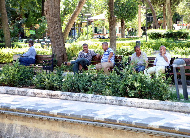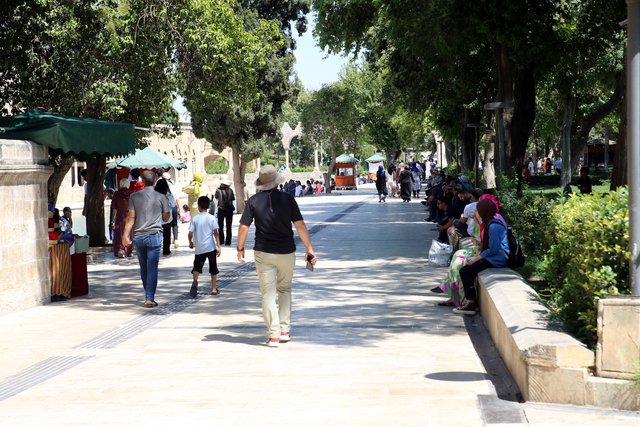 Termometrelerin 45 dereceyi gösterdiği kentte vatandaşlar, park ve tarihi Balıklıgöl Yerleşkesi'ndeki yeşil alanlarda serinlemeye çalışıyor.