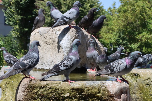 Sıcak hava, sokak hayvanlarını da olumsuz etkilerken, kuşlar süs havuzlarında rahatlamaya çalıştı.