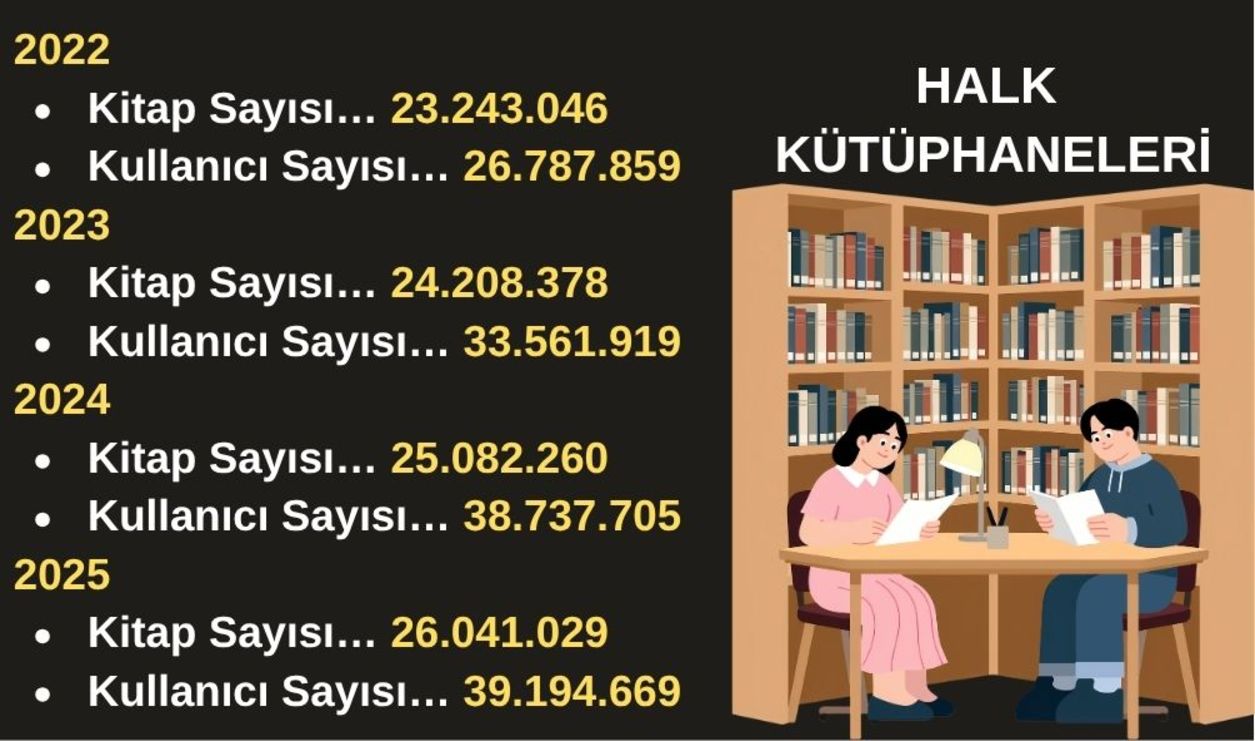 Son yıllarda yoğunlaştırdığımız çabalarımız ile kütüphanelerimizde geniş çaplı bir dijital dönüşüm gerçekleştiriyoruz. Bir yandan 'Yapay Zekâ Temelli Kütüphaneler' projesiyle sesli iletişim kurulabilen dijital kütüphane asistanları ile bilgiye erişim sınırlarını olabildiğince genişletiyoruz. Öte yandan Millî Dijital Kütüphane Projesi ile Millî Kütüphanedeki milyonlarca bilgi kaynağını hızla dijitalleştiriyor, il ve ilçe halk kütüphanelerimizdeki dijital erişim istasyonlarıyla sayısız kaynağı ülkemizin dört bir yanında erişilebilir hâle getiriyoruz. Araştırmacılar için sunduğumuz dijital bilgi kaynaklarını hızla büyütüyoruz. Çevrim içi akademik veri tabanı sayısını 35'e çıkardık. E-kitap ve sesli kitap formatlarında hızla kitap üretiyor, kütüphane kullanıcılarımız için bu kaynaklara ulaşabilecekleri mobil dijital platformlar oluşturuyoruz. Millî Kütüphane dijitalleştirme altyapısı ve makine parkuru geliştiriliyor, dijitalleşme çalışmaları hız kazanıyor. Millî Kütüphane koleksiyonunda bulunan eserlerle diğer kamu kurum ve kuruluşlarından gelen materyaller tam otomatik tarayıcılar aracılığıyla hızla dijitalleştiriliyor. Bu çalışmalar kapsamında kitaplarla birlikte dergi ve gazete gibi süreli yayınlar; harita, afiş, kartpostal gibi kitap dışı materyaller ve nadir eserler dijital ortama taşınıyor. Millî kütüphane dijital hizmetleri çeşitlenerek bilime ve sanata katkı sunmaya devam ediyor. 2025'te 2.132.697 dijital poz üretildi. 2026 hedefi en az ise 4 milyon yeni poz.