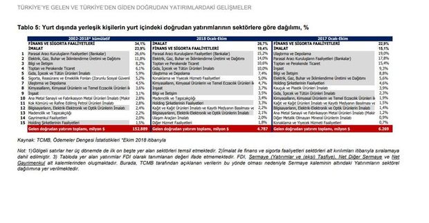 Türkiye Ekonomi Politikaları Araştırma Vakfı´nın, Türkiye´ye gelen ve Türkiye´den giden doğrudan yatırımlarla ilgili yayınladığı değerlendirme notuna göre, en çok yatırım Hollanda´dan geldi. 2002-2018 dönemini kapsayan kümülatif verilere göre yurt dışındaki yerleşiklerin yurt içine yaptıkları yaklaşık 152.9 milyar dolarlık doğrudan yatırımın yüzde 16´sı Hollanda´dan, yüzde 7.6´sı ABD´den, yüzde 6.9´u Avusturya´dan, yüzde 6.7´si Birleşik Krallık'tan ve yüzde 6.2´si Almanya´dan geldi. Bu yatırımın yüzde 61.7´si hizmetler sektöründe, yüzde 37.9´u sanayi ve yüzde 0.4´ü de tarım sektöründe gerçekleşti
