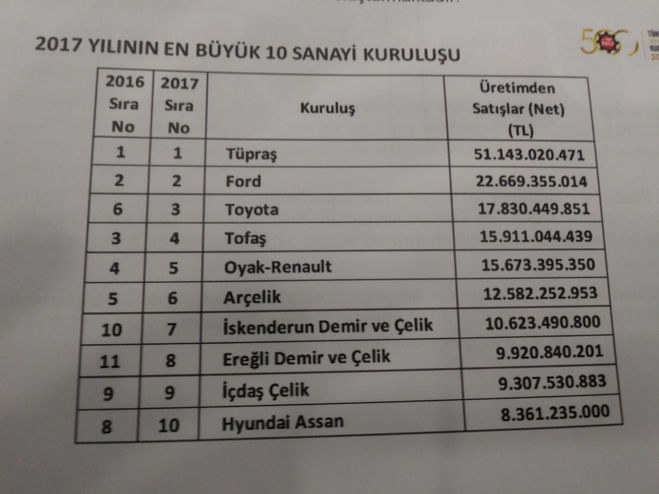 İSO, “Türkiye’nin 500 Büyük Sanayi Kuruluşu-2017” araştırmasını açıkladı. İstanbul Sanayi Odası’nın (İSO) yarım asrı deviren ve sanayi sektörünün en değerli verilerini oluşturan “Türkiye’nin 500 Büyük Sanayi Kuruluşu” araştırmasına göre 2017 yılının zirvesinde 51,1 milyar TL’lik üretimden satışları ile yine TÜPRAŞ yer aldı. Ford Otomotiv 22,7 milyar TL’lik üretimden satışlarıyla ikinciliği korurken, üçüncü ise 2016 yılına göre üç basamak yükselen 17,8 milyar TL üretimden satışlarıyla Toyota Otomotiv oldu.