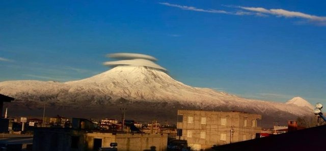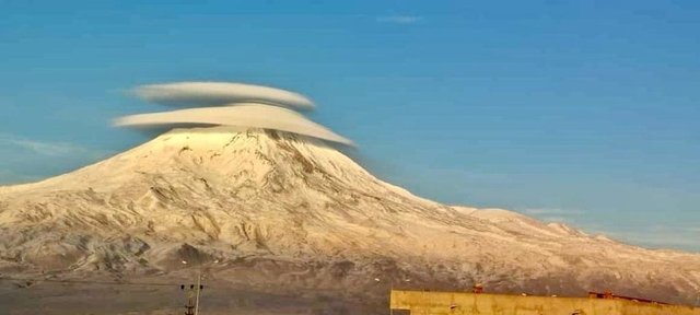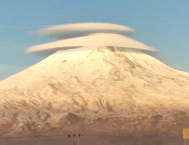 Doğubayazıt ilçesinde bulunan ve yüksekliği nedeniyle Türkiye'nin çatısı olarak nitelendirilen, çevresinde kar ve sisin eksik olmadığı, Ağrı Dağı'nın zirvesinde oluşan şapkayı andıran bulut kartpostallık görüntü oluşturdu.