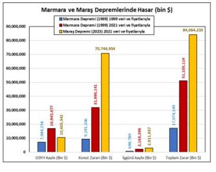 Söz konusu hesaplamalar 2021 dolar bazlı veriler üzerinden yapıldı. 2021 dolar verileriyle 1999 Marmara depreminin yarattığı mali kayıp 51 milyar 105 milyon dolar olarak hesaplandı. Yani rapora göre Kahramanmaraş depremi sebepli mali kayıp Marmara depremini geride bıraktı.