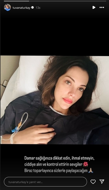 Tuvana Türkay, "Damar sağlığınıza dikat edin, ihmail etmeyin, ciddiye alın ve kontrol ettirin sevgiler. Biraz toparlayınca sizlerle paylaşacağım" dedi.