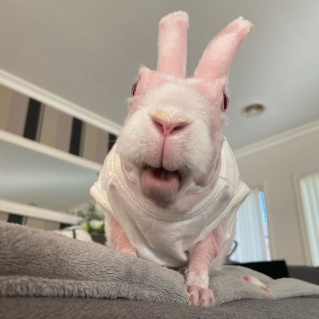 Tüyleri olmadığı için zaman zaman titreyen tavşan takipçileri tarafından hediye edilen kazak ve çeşitli kıyafetlerle sıcak kalıyor.