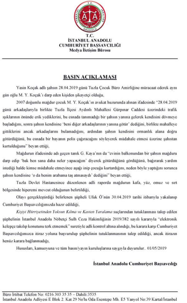 Tuzla'da 12 yaşındaki bir çocuğu darp edip adli kontrol şartıyla serbest bırakılan Ufuk Ö. hakkında yeni bir gelişme yaşandı