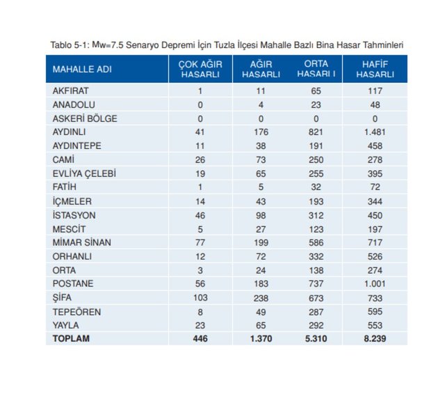 *7.5 Senaryo Depremi İçin Tuzla İlçesi Mahalle Bazlı Bina Hasar Tahminleri