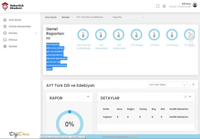 Her dersin kendi sayfalarına ulaşmak için ilgili derse tıklayın. Dersle ilgili Durumunuzu gözden geçirebilir, Çalışma Planına, Testlere, Konu Anlatımlarına, Raporlarına ulaşabilirsiniz.