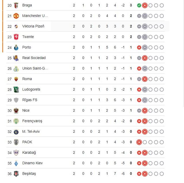 Beşiktaş iki maçta aldığı 2 mağlubiyetle 36. sırada yer alıyor.