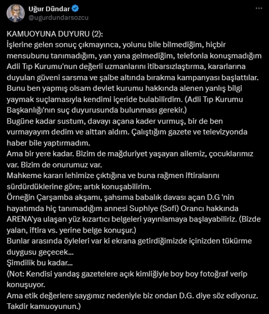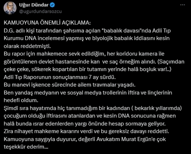 Uğur Dündar, 'Kamuoyuna önemli açıklama' başlığıyla şu ifadeleri duyurdu: D.G. adlı kişi tarafından şahsıma açılan 'babalık davası'nda Adli Tıp Kurumu DNA incelemesi yapmış ve biyolojik babalık iddiasını kesin olarak reddetmişti. Bu rapor için mahkemece sevk edildiğim, her koridoru kamera ile görüntülenen devlet hastanesinde kan ve saç örneğim alındı. (Saçımdan çeke çeke, sökerek kopartılan bir tutamın yerinde hâlâ boşluk var!) Adli Tıp Raporunun sonuçlanması 7 ay sürdü. Bu manevi işkence sürecinde ailem travmalar yaşadı. Ben yandaş medyanın ve sosyal medya trollerinin iftira ve linçlerinin hedefi oldum. Şimdi sıra hayatımda hiç tanımadığım bir kadından (bekarlık yıllarımda) çocuğum olduğu iftirasını atanlardan ve kesin DNA sonucuna rağmen hâlâ bunda ısrar edenlerden yargı önünde hesap sormaya geliyor. Zira nihayet mahkeme kararını verdi ve bu gereksiz davayı reddetti. Kamuoyuna saygıyla duyurur, değerli Avukatım Murat Ergün'e çok teşekkür ederim...